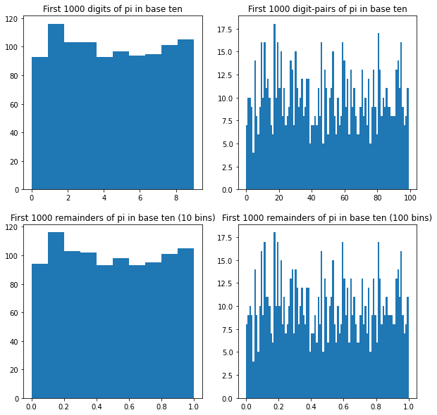 - For almost all numbers, for any k, the distribution of length-k substrings of the base-ten representation approaches a uniform distribution.